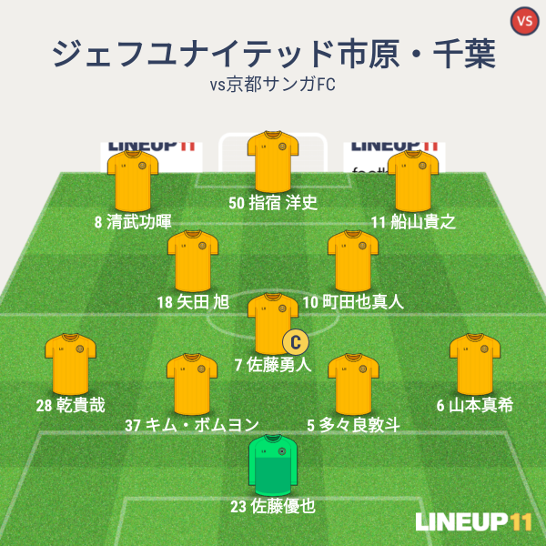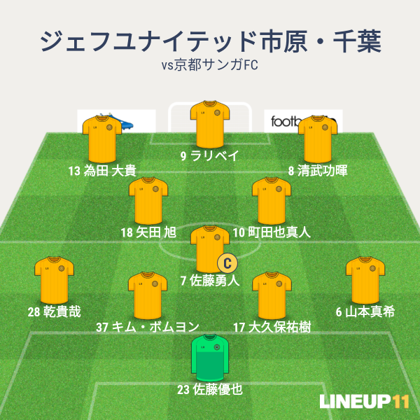 ジェフの先発は、GKに優也、CBに近藤とボムヨン、右SBに真希、左SBに乾、アンカーに勇人、ISHに町田と矢田、右SHに清武、左SHに為田、1トップにラリベイという布陣でした。優也が先発復帰。近藤は怪我の影響か大久保が先発。熊谷の件があって勇人が先発となりました。
