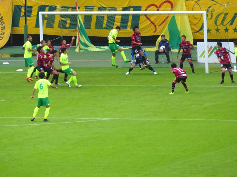 ジェフは、前半26分、ラリベイの落としから船山がシュートを狙うが左に外れます。前半30分、ジェフのCK。フリーの状態からラリベイのヘディングシュートは味方に当たってしまいます。