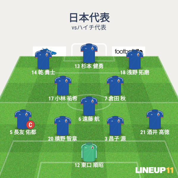日本の先発は、GKに東口、CBに槙野と昌子、右SBに酒井高徳、左SBに長友、アンカーに遠藤、ISHに倉田と小林、右SHに浅野、左SHに乾、1トップに杉本という布陣でした。ニュージーランド戦からガラッとメンバーを入れ替えてきました。