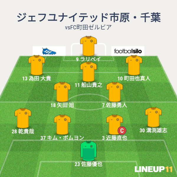 ジェフの先発は、GKに優也、CBに近藤、ボムヨン、右SBに真希、左SBに乾、ダブルボランチに勇人と矢田、右SHに町田、左SHに為田、トップ下に船山、トップにラリベイという布陣でした。為田が先発起用となり、清武がベンチスタートとなりました。