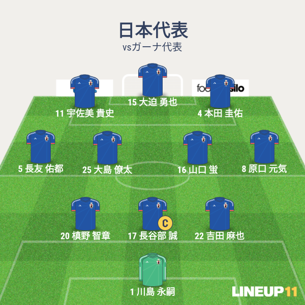 日本の先発は、GKに川島、CBに長谷部と吉田と槙野、ボランチに山口と大島、右WBに原口、左WBに長友、シャドーに本田と宇佐美、1トップに大迫という布陣でした。3バックの真ん中に長谷部を起用するという新布陣でのぞみます。