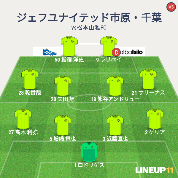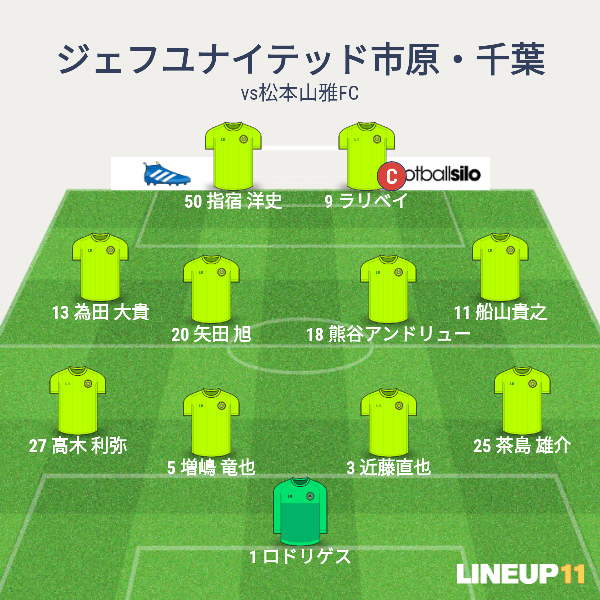 ジェフの先発メンバーは、GKにロドリゲス、CBに近藤、増嶋、右SBに茶島、左SBに高木、ダブルボランチに熊谷と矢田、右SHに船山、左SHに為田、2トップにラリベイと指宿という布陣でした。茶島が先発に復帰しています。