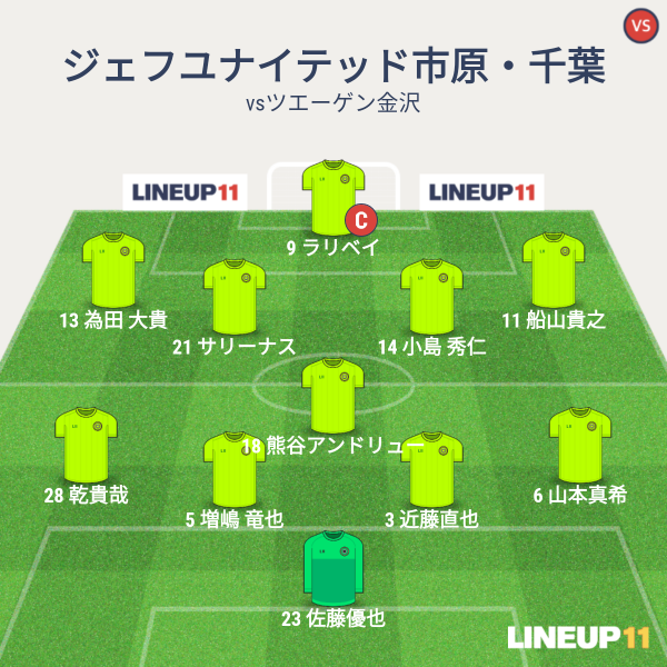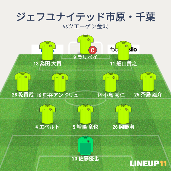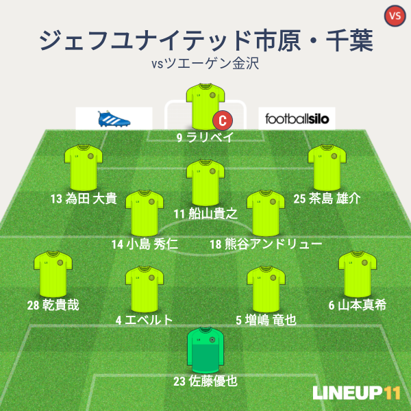 ジェフの先発メンバーは、GK優也、3バックに増嶋、エベルト、岡野、ダブルボランチに熊谷と小島、右WBに茶島、左WBに乾、右WGに船山、左WGに為田、1トップにラリベイという布陣です。天皇杯の神戸戦での布陣を継続してきました。