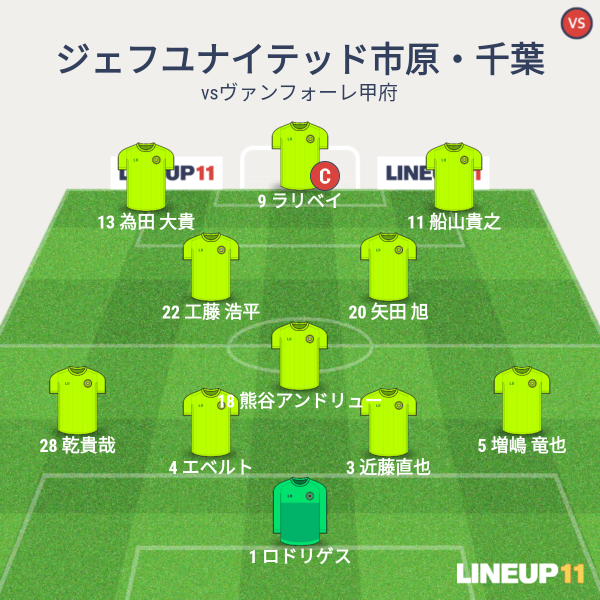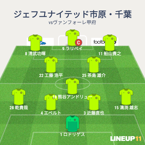 ジェフの先発メンバーは、GKロドリゲス、CBに近藤とエベルト、右SBに溝渕、左SBに乾、アンカーに熊谷、ISHに茶島と工藤、右SHに船山、左SHに清武、1トップにラリベイという布陣です。工藤が移籍後初先発となりました。溝渕、清武も久しぶりに先発です。