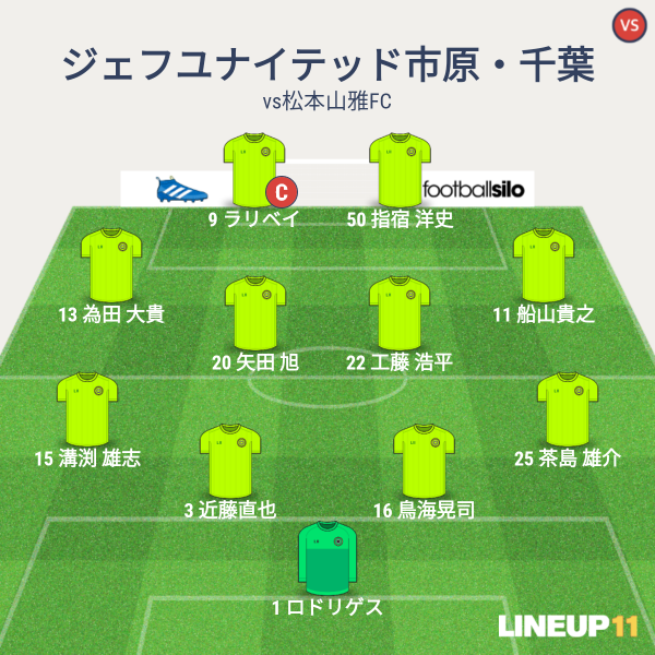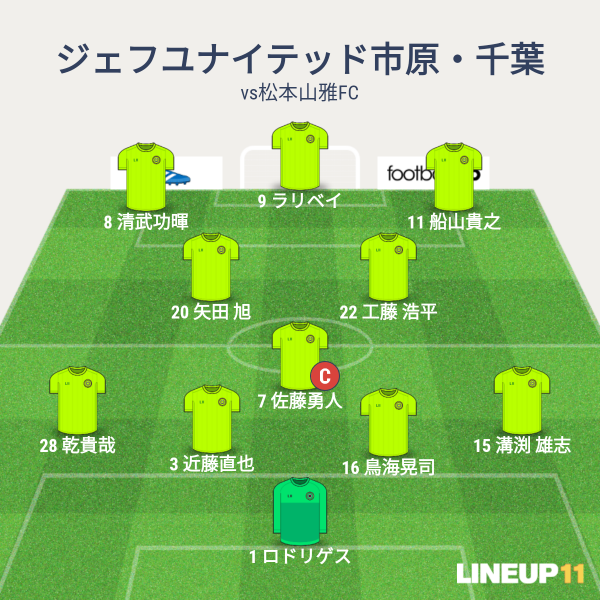 ジェフの先発メンバーは、GKロドリゲス、CBに近藤と鳥海、右SBに溝渕、左SBに乾、アンカーに勇人、ISHに工藤と矢田、右SHに船山、左SHに清武、1トップにラリベイという布陣です。