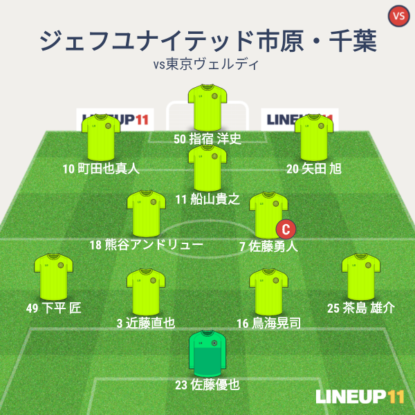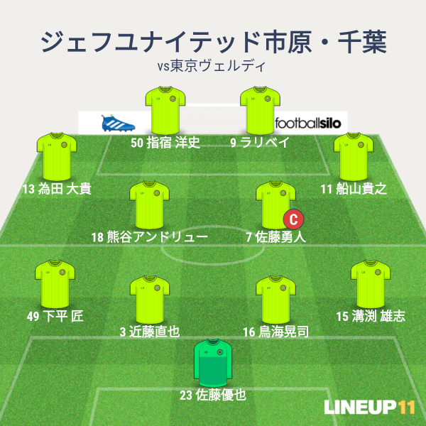 ジェフの先発メンバーは、GK優也、CBに近藤と鳥海、右SBに溝渕、左SBに下平、ボランチに勇人と熊谷、右SHに船山、左SHに為田、2トップにラリベイと指宿という布陣です。