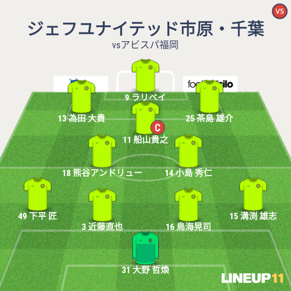 ジェフの先発メンバーは、GK大野、CBに近藤と鳥海、右SBに溝渕、左SBに下平、ボランチに小島と熊谷、右SHに町田、左SHに矢田、トップ下に船山、トップに指宿という布陣です。