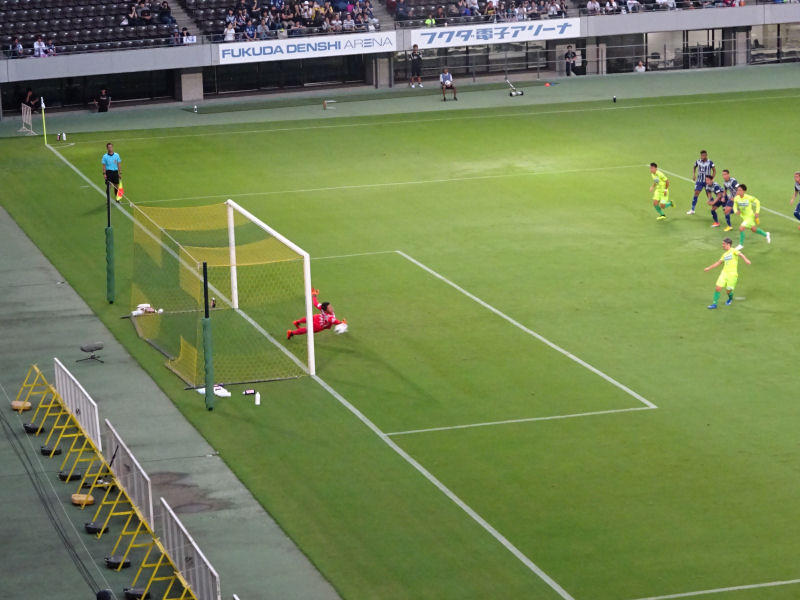 それでも、この試合の船山はすごかった。この時間帯、同点に追いついた福岡に勢いがあったのですが、ここぞという場面での近藤の持ち上がり。茶島の折返しもギリギリのタイミングでしたが、船山が足を伸ばして決めました。これで勝てれば良かったのですが、福岡も城後を投入して、最後に追いつきました。鳥海に当たったボールが見事に城後のところに落ちてくるんですよね。大野もあの至近距離で反応しましたが、ボールは無情にもゴールへ。