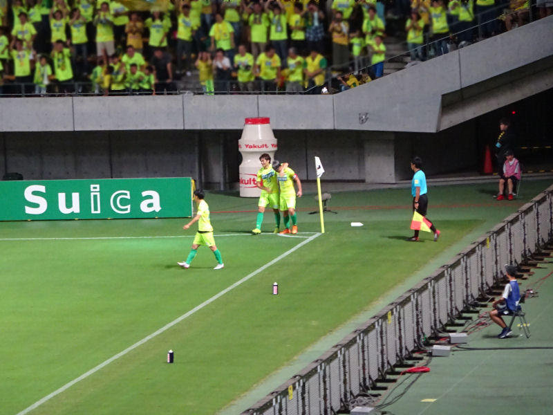 後半1分、指宿が突破してシュートもブロックされるがCKに。このCKは、合わせきれずも、相手のハンドでFKを得る。このFKを船山が直接決めてジェフが2-1と逆転する。