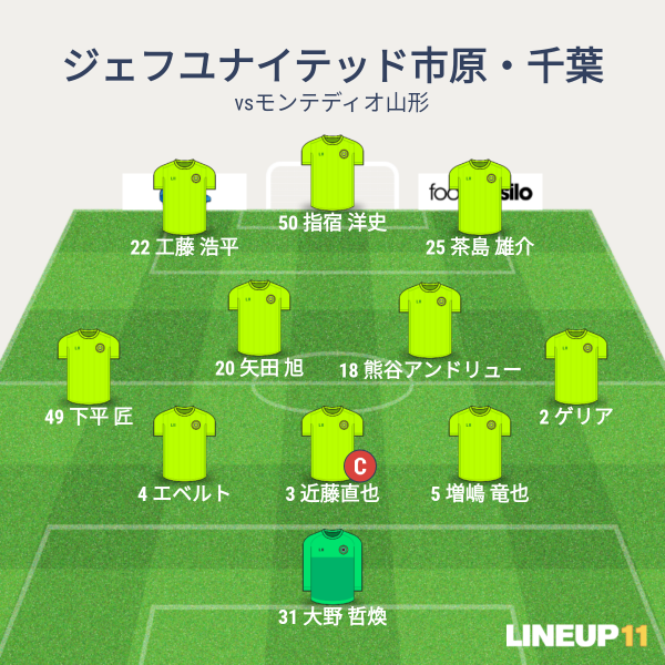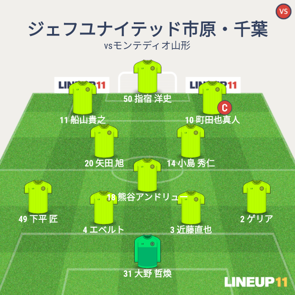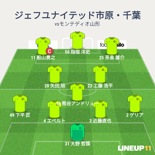 ジェフの先発メンバーは、GK大野、CBに近藤とエベルト、右SBにゲリア、左SBに下平、アンカーに熊谷、ISHに小島と矢田、右SHに町田、左SHに船山、トップに指宿という布陣です。先発は前節で変わらず。スタートは4-1-2-3というフォーメーションとなりました。
