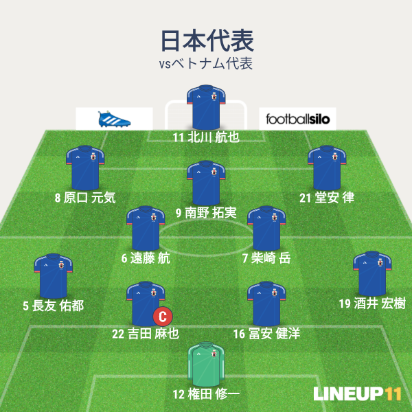日本の先発は、GKに権田、CBに吉田と冨安、右SBに酒井、左SBに長友、ボランチに柴崎と遠藤、右SHに堂安、左SHに原口、トップ下に南野、トップに北川という布陣でした。