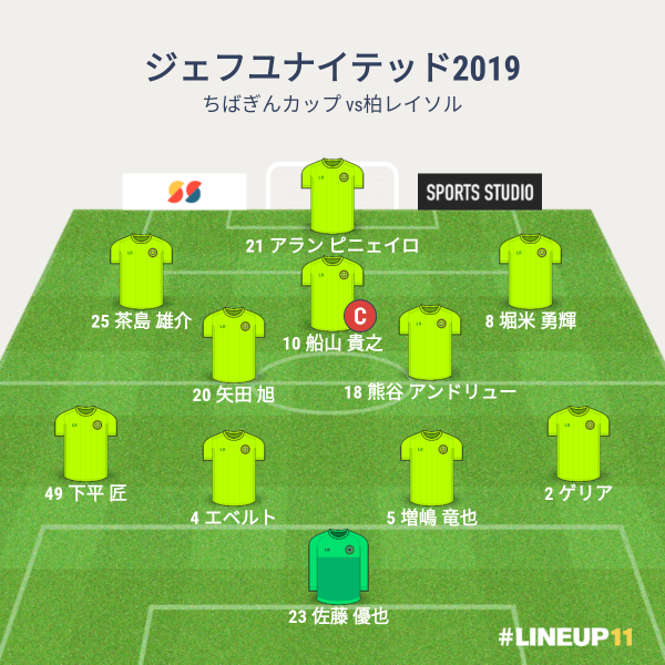 ジェフの先発メンバーは、GKに優也、CBに増嶋とエベルト、右SBにゲリア、左SBに下平、ボランチに熊谷と矢田、右SHに掘込、左SHに茶島、トップ下に船山、トップにアラン・ピニェイロという。
