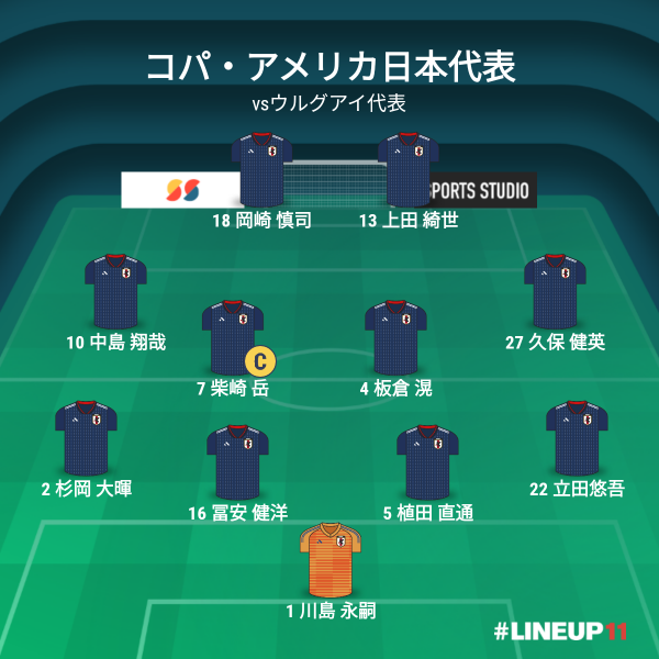 日本の先発は、GKに川島、CBに植田と冨安、右SBに岩田、左SBに杉岡、ボランチに柴崎と板倉、右SHに三好、左SHに中島、トップ下に安部、トップに岡崎という布陣でした。前の試合からメンバーをかなり入れ替えてきました。