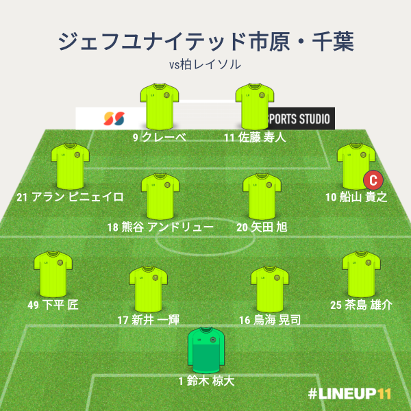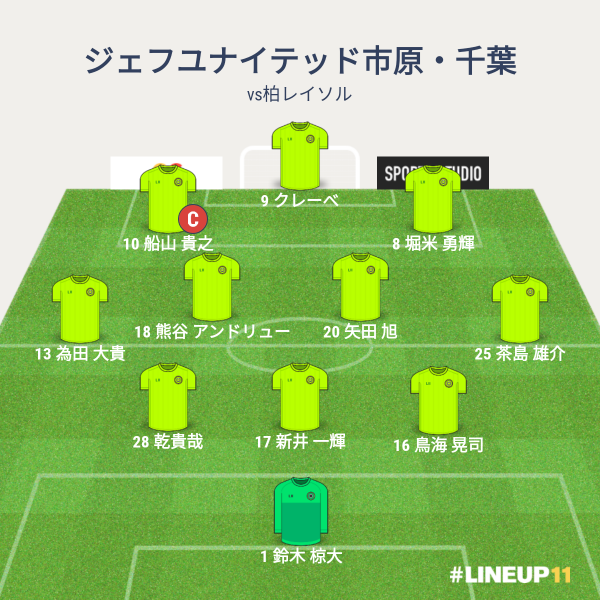 ジェフの先発メンバーは、GKに鈴木、CBに新井と鳥海と乾、右WBに茶島、左WBに為田、ボランチに熊谷と矢田、シャドーに船山と堀米、トップにクレーベという布陣でした。増嶋が出れないので新井が先発に。
