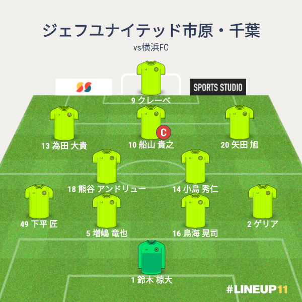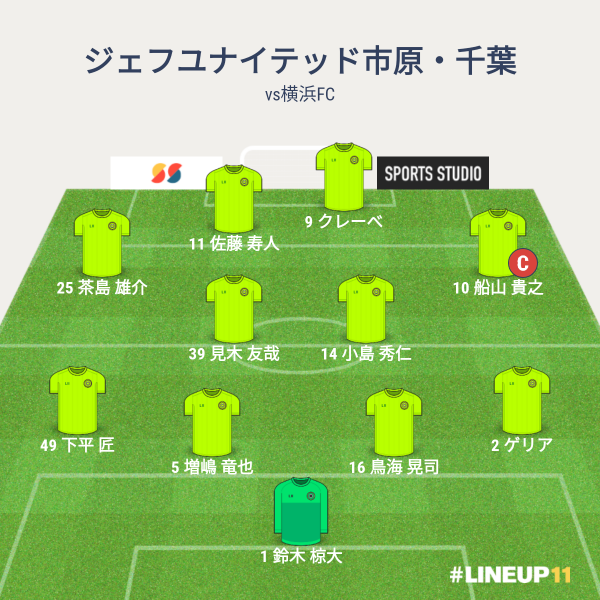 ジェフの先発メンバーは、GKに鈴木、CBに増嶋と鳥海、右SBにゲリア、左SBに下平、ボランチに熊谷と小島、右SHに矢田、左SHに為田、トップ下に船山、トップにクレーベとなりました。前節から小島が入って、矢田が前目に入りました。