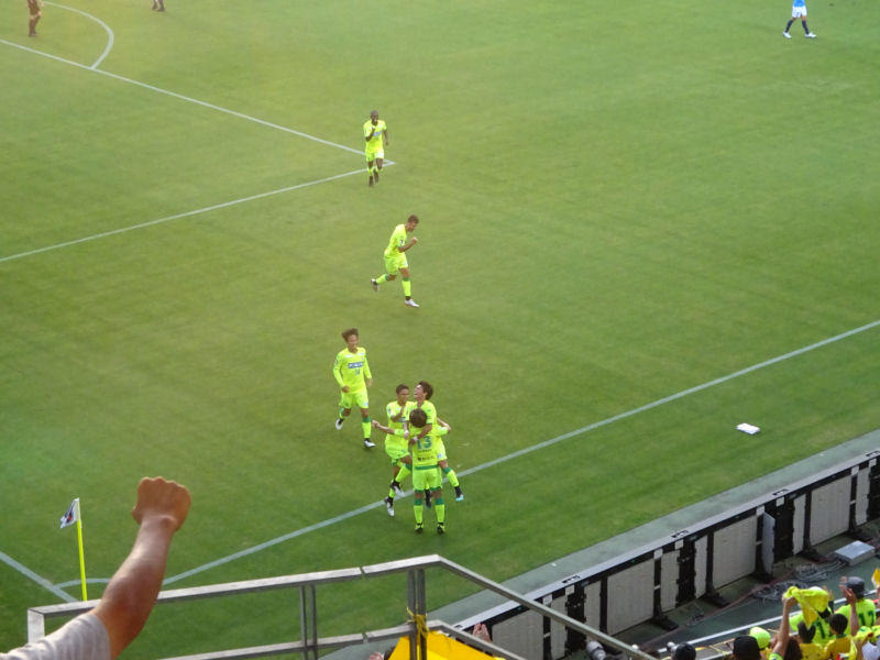 しかし、後半20分、横浜FCのロングスロー。こぼれたボールに、松井がバイシクルで合わせてゴール。横浜FCが勝ち越します。