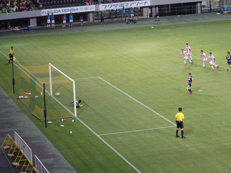 前半、両チームにチャンスがあったものの、先制したのはジェフ。クレーべがうまくファウルをもらってPKの判定。これを船山が決めきりました。ポストに当たったもののゴールイン