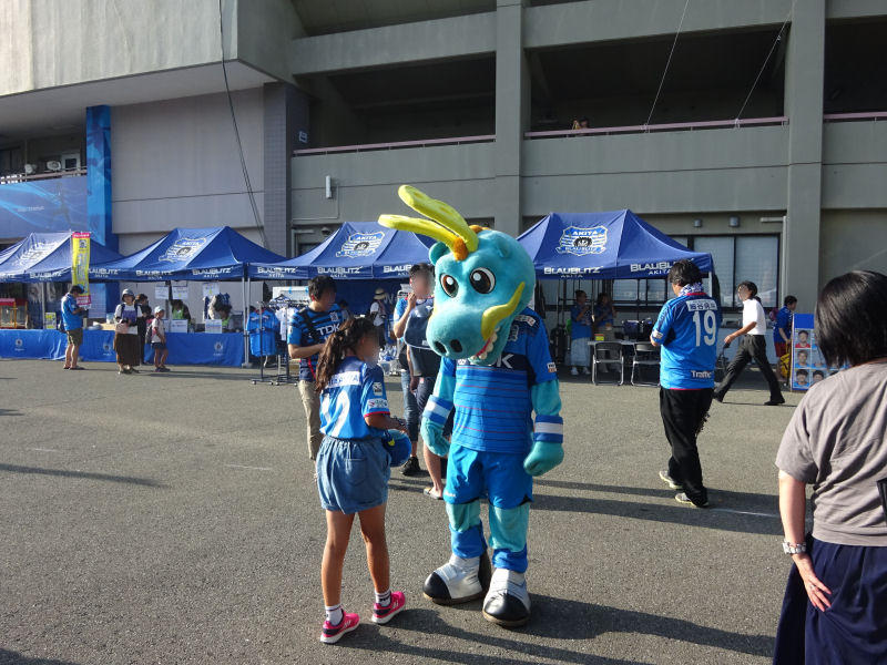 メイン側で観戦だったので入場後に屋台村へ。マスコットのブラウゴンがうろうろしていました。結構、気軽に撮影に応じたり、大忙しです。