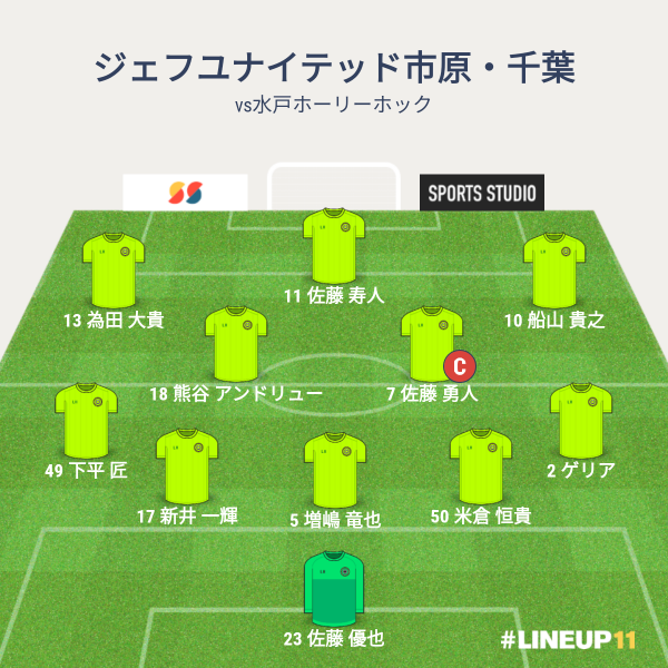 ジェフの先発メンバーは、GKに優也、CBに増嶋と新井、右SBに米倉、左SBに下平、ボランチに勇人と熊谷、右SHに茶島、左SHに為田、トップ下に工藤、トップにクレーベとなりました。優也、増嶋、工藤、茶島がメンバー変更。船山がサブに回る事になりました。