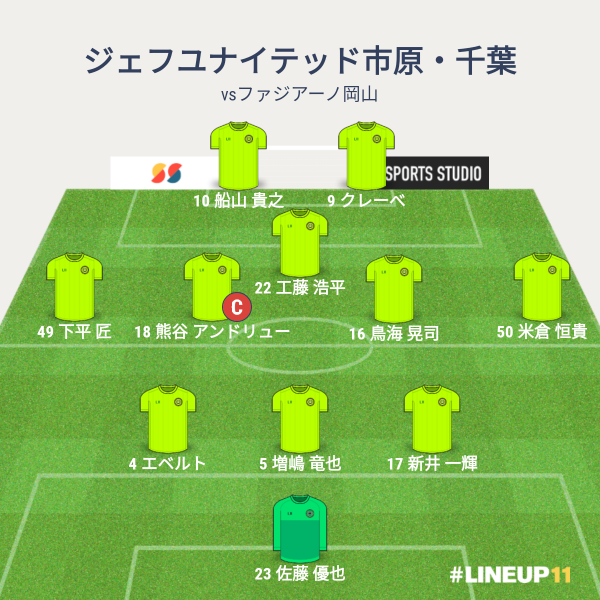 ジェフの先発メンバーは、GKに優也、CBに増嶋と新井、右SBに米倉、左SBに下平、ボランチに勇人と熊谷、右SHに矢田、左SHに為田、トップ下に工藤、トップにクレーベとなりました。
