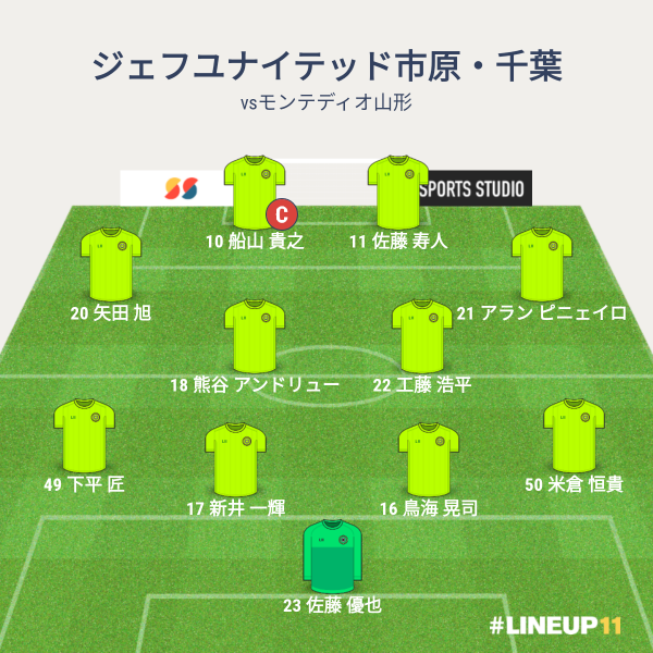 ジェフの先発メンバーは、GKに優也、CBに増嶋と新井、右SBに米倉、左SBに下平、ボランチに勇人と熊谷、右SHにアラン・ピニェイロ、左SHに矢田、トップ下に工藤、トップにクレーベとなりました。為田が累積警告のため、アラン・ピニェイロが入りました。