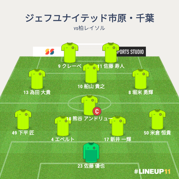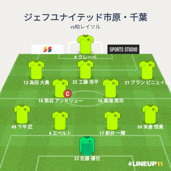 ジェフの先発メンバーは、GKに優也、CBにエベルトと新井、右SBに米倉、左SBに下平、ボランチに熊谷と鳥海、右SHにアラン・ピニェイロ、左SHに為田、トップ下に工藤、トップにクレーベとなりました。右SHには、アラン・ピニェイロが入りました。