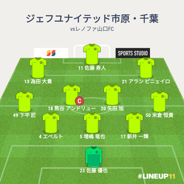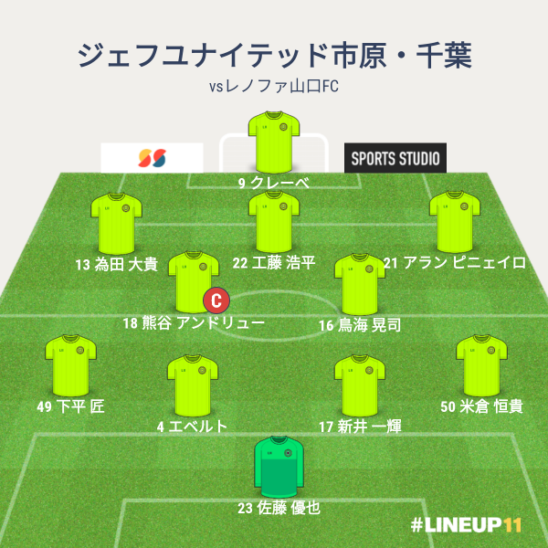ジェフの先発メンバーは、GKに優也、CBに新井とエベルト、右SBに米倉、左SBに下平、ボランチに熊谷と鳥海、右SHにアラン・ピニェイロ、左SHに為田、トップ下に工藤、トップにクレーベとなりました。前節と同じ先発メンバーとなりました。