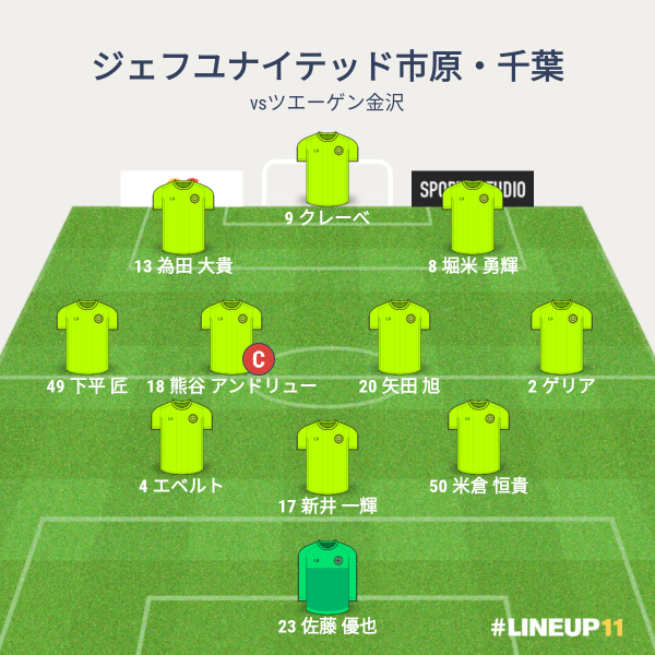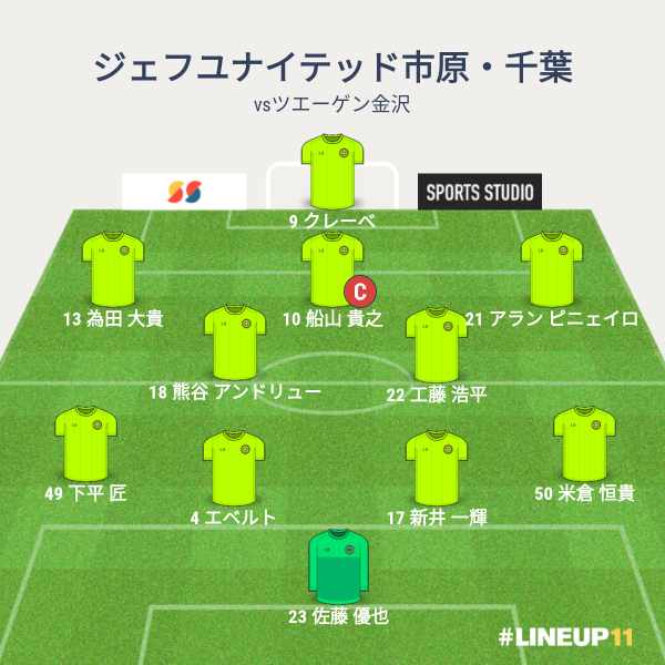 ジェフの先発メンバーは、GKに優也、CBにエベルトと新井、右SBに米倉、左SBに下平、ボランチに熊谷と工藤、右SHにアラン・ピニェイロ、左SHに為田、トップ下に船山、トップにクレーベとなりました。船山がスタメン復帰。ボランチには工藤が入りました。