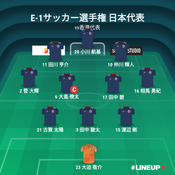 日本の先発は、GKに大迫、CBに田中駿太、渡辺、古賀、ボランチに大島と田中碧、右WBに相馬、左WBに菅、シャドーに田川と仲川、トップに小川という布陣でした。