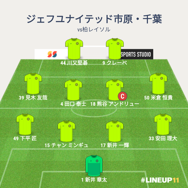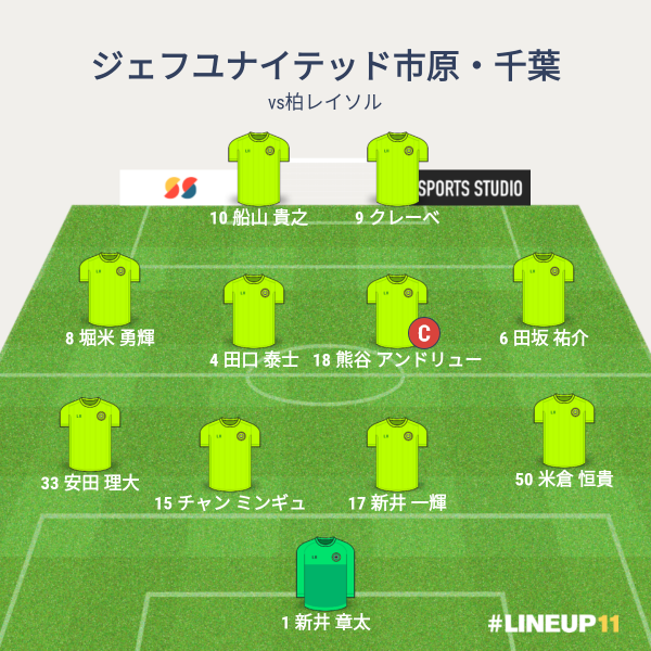 ジェフの先発メンバーは、GKに新井章太、CBに新井とチャン、右SBに米倉、左SBに安田、ボランチに熊谷と田口、右SHに田坂、左SHに堀米、2トップに船山とクレーベでした。