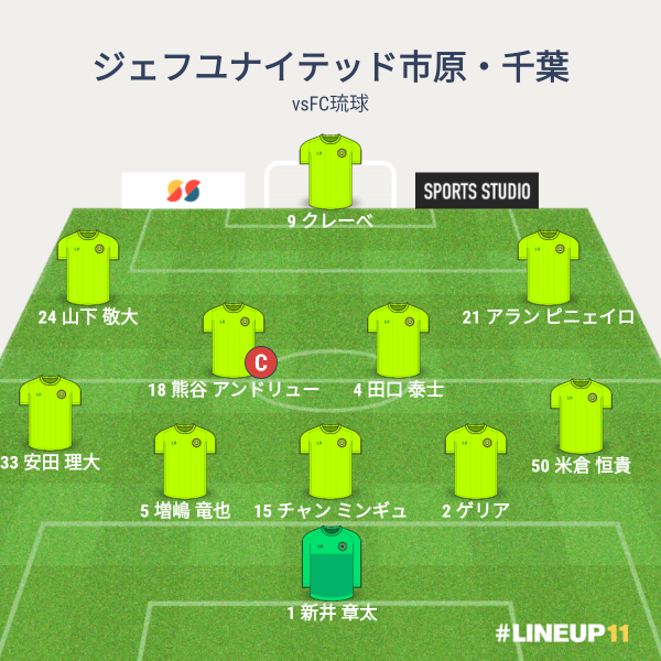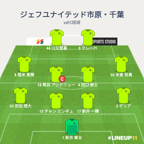 ジェフの先発メンバーは、GKに新井章太、CBに新井とチャン、右SBにゲリア、左SBに安田、ボランチに熊谷と田口、右SHに米倉、左SHに堀米、2トップにクレーベと川又でした。
