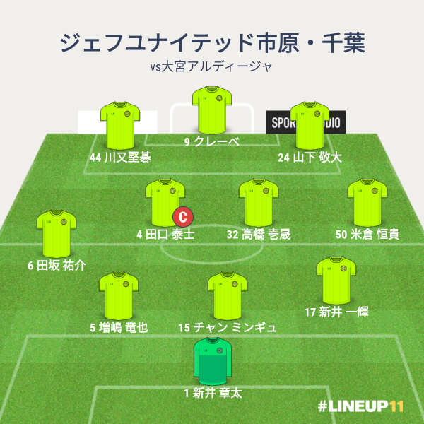 ジェフの先発メンバーは、GKに新井章太、CBに増嶋とチャン、右SBにゲリア、左SBに下平、ボランチに田口と壱晟、右SHにアラン・ピニェイロ、左SHに堀米、2トップにクレーベとでした。