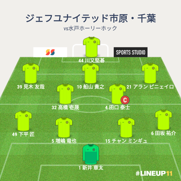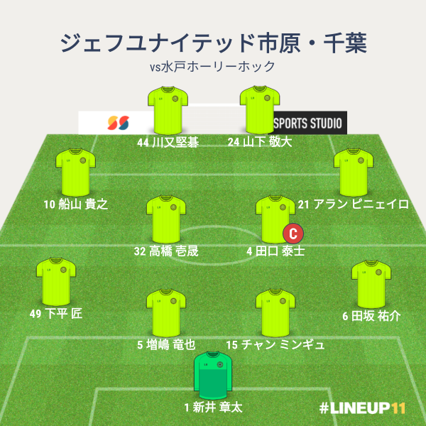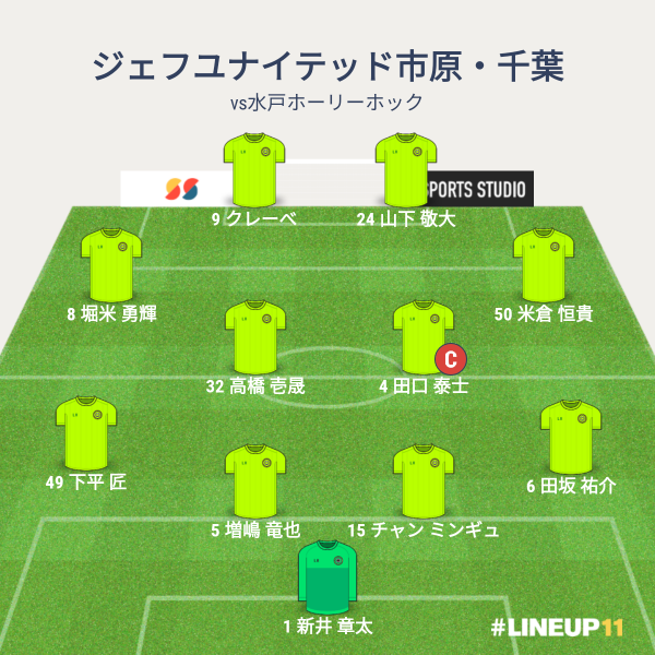 ジェフの先発メンバーは、GKに新井章太、CBに増嶋とチャン、右SBに田坂、左SBに下平、ボランチに田口と壱晟、右SHに米倉、左SHに堀米、2トップにクレーベとでした。前節から、右サイドの2人を入れ替えてきました。