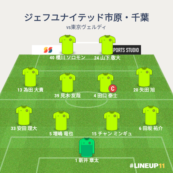 ジェフの先発メンバーは、GKに新井章太、CBに増嶋とチャン、右SBに田坂、左SBに下平、ボランチに田口と壱晟、右SHに米倉、左SHに船山、2トップに川又と山下でした。クレーベ、堀米がベンチ外となりました。