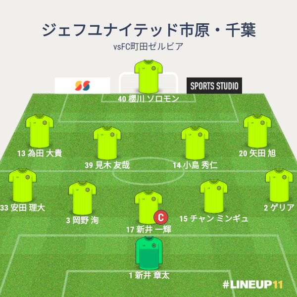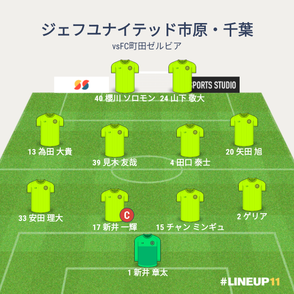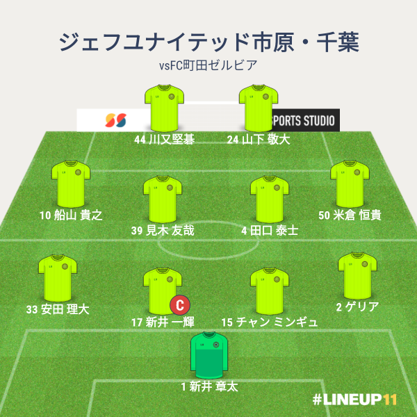 ジェフの先発メンバーは、GKに新井章太、CBに新井一耀とチャン、右SBにゲリア、左SBに安田、ボランチに田口と見木、右SHに米倉、左SHに為田、2トップに川又と山下でした。両SHなど5人が前節から変わる。