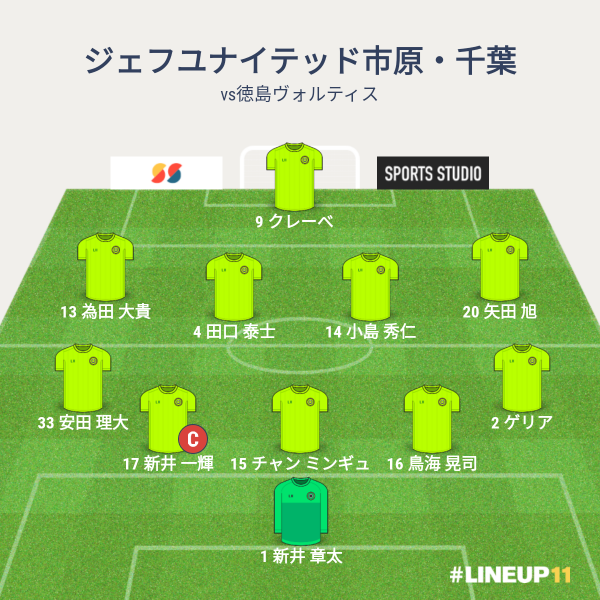 ジェフの先発メンバーは、GKに新井章太、CBに新井一耀とチャン、右SBにゲリア、左SBに安田、ボランチに田口と見木、右SHに堀米、左SHに船山、2トップに川又と山下でした。