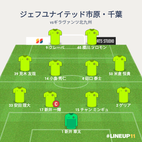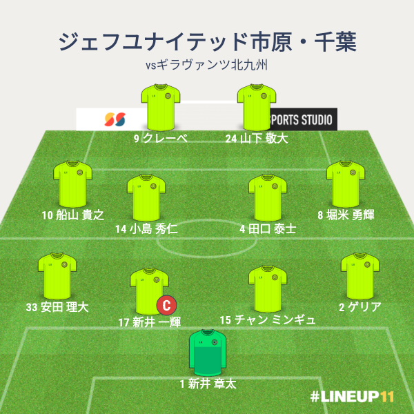 ジェフの先発メンバーは、GKに新井章太、CBに新井一輝とチャン、右SBにゲリア、左SBに安田、ボランチに小島と田口、右SHに堀米、左SHに船山、2トップにクレーベと山下でした。