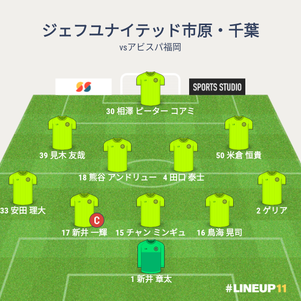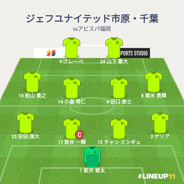 ジェフの先発メンバーは、GKに新井章太、CBに新井一耀とチャン、右SBにゲリア、左SBに安田、ボランチに田口と小島、右SHに堀米、左SHに船山、2トップにクレーベと山下でした。