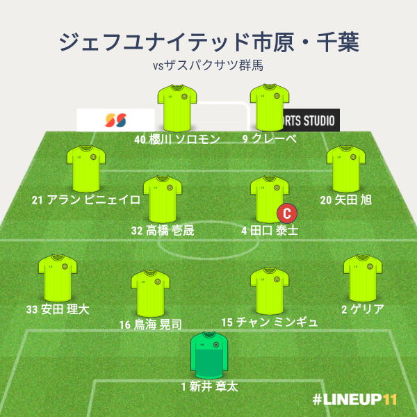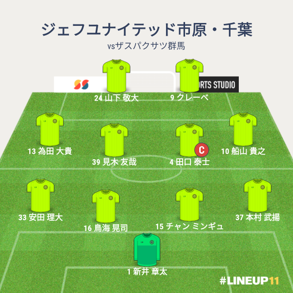 ジェフの先発メンバーは、GKに新井章太、CBに鳥海とチャン、右SBに本村、左SBに安田、ボランチに、田口と見木、右SHに船山、左SHに為田、2トップにクレーベと山下という布陣でした。