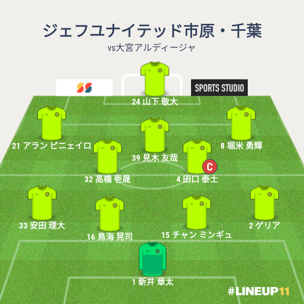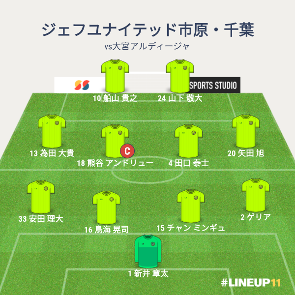 ジェフの先発メンバーは、GKに新井章太、CBに鳥海とチャン、右SBにゲリア、左SBに安田、ボランチに、田口と熊谷、右SHに矢田、左SHに為田、2トップに船山と山下という布陣でした。ゲリア、熊谷、山下が先発になりました。
