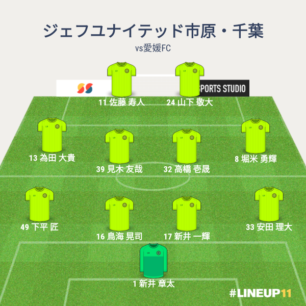 ジェフの先発メンバーは、GKに新井章太、CBに新井一輝と鳥海、右SBに本村、左SBに安田、ボランチに小島と壱晟、右SHに矢田、左SHにアラン、2トップに船山と山下でした。