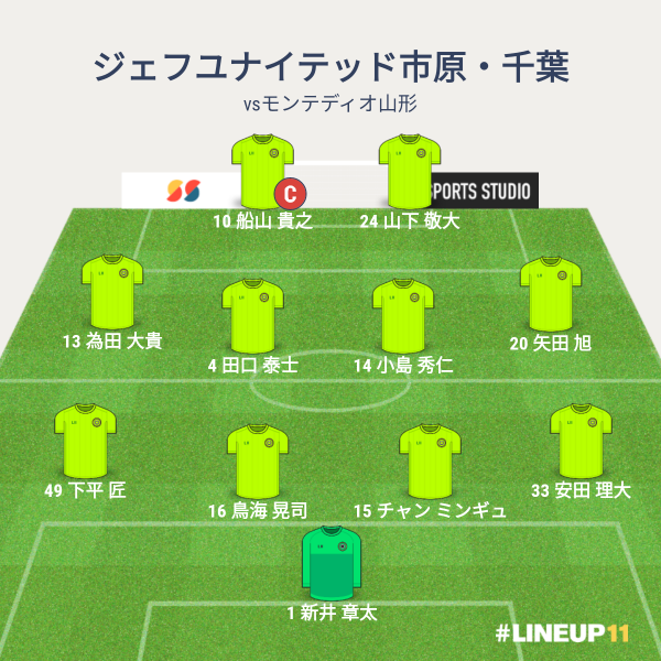 ジェフの先発メンバーは、GKに新井章太、CBに鳥海とチャン、右SBに安田、左SBに下平、ボランチに田口と小島、右SHに矢田、左SHに為田、2トップに船山と山下でした。