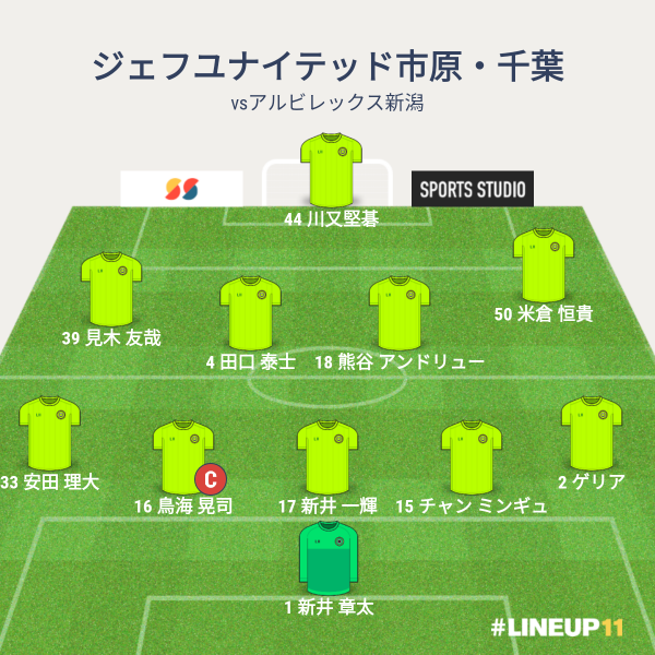 ジェフの先発は、GKに新井、CBに鳥海と新井一輝、右SBにゲリア、左SBに安田、ボランチに田口と壱晟、右SHに堀米、左SHにアラン、2トップにクレーベと船山でした。