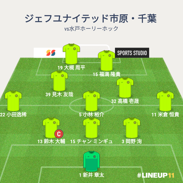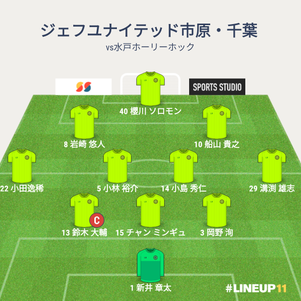 ジェフの先発メンバーは、GKに新井章大、CBに鈴木大輔とチャンと岡野、右SBに米倉、左SBに小田、アンカーに小林、ISHに壱晟と見木、トップ下に福満、トップに大槻でした。前節に続いて3バックを採用としました。