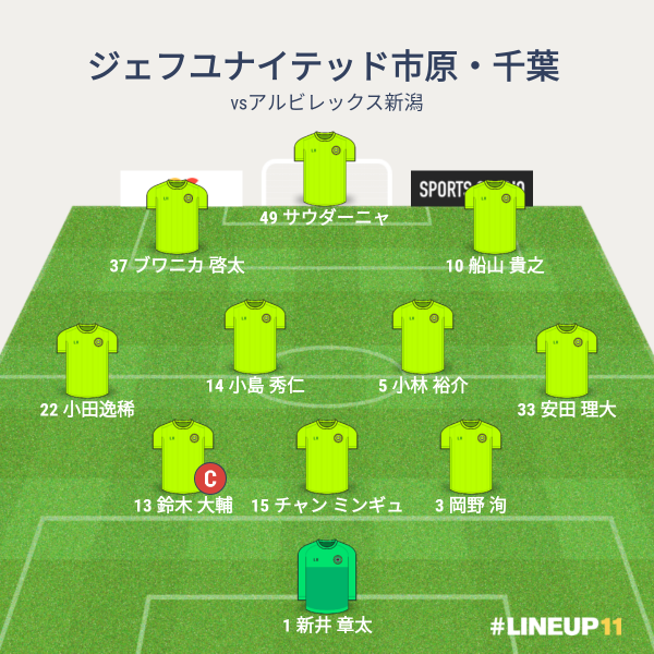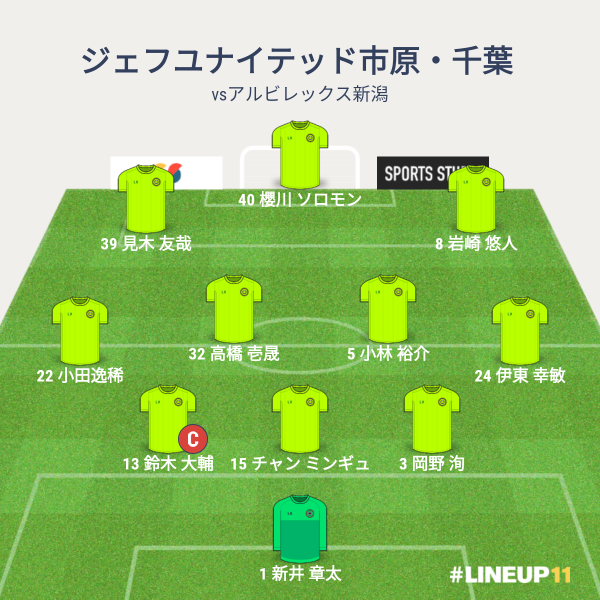 ジェフの先発メンバーは、GKに新井章大、CBに鈴木大輔とチャンと岡野、右SBに伊東、左SBに小田、アンカーに小林、ISHに壱晟と見木、2トップに岩崎とソロモンでした。