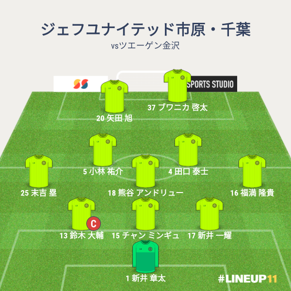 ジェフの先発メンバーは、GKに新井、CBに鈴木大輔とチャンと新井一輝、右SBに安田、左SBに小田、ダブルボランチに田口と小林、右WGに船山、左WGに見木、トップにサウダーニャという布陣でした。