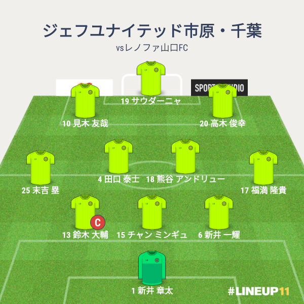 ジェフの先発メンバーは、GKに新井章大、CBに鈴木大輔と新井一輝とチャン、右WBに福満、左WBに末吉、ダブルボランチに田口と熊谷、右WGに高木、左WGに見木、トップにサウダーニャという布陣でした。