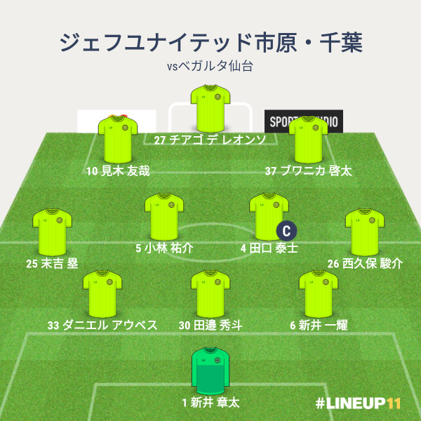 ジェフの先発メンバーは、GKに新井、CBに新井一輝と田邉とダニエル、右WBに西久保、左WBに末吉、ボランチに田口と小林、右にブワニカ、左に見木。トップにチアゴとなりました。新井一輝が先発に戻ってきました。