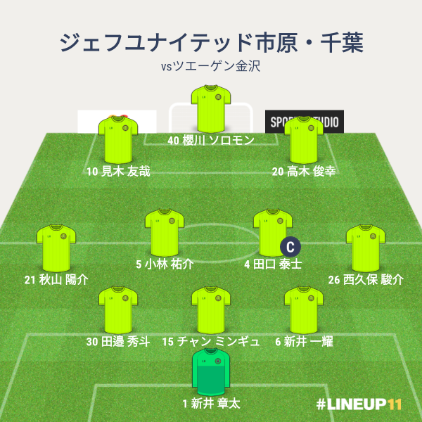 ジェフの先発メンバーは、GKに新井、CBに新井一輝とチャンと田邉、ボランチに田口と小林、右WBに西久保、左WBに秋山、右WGに高木、左WGに見木、トップにソロモンという布陣でした。