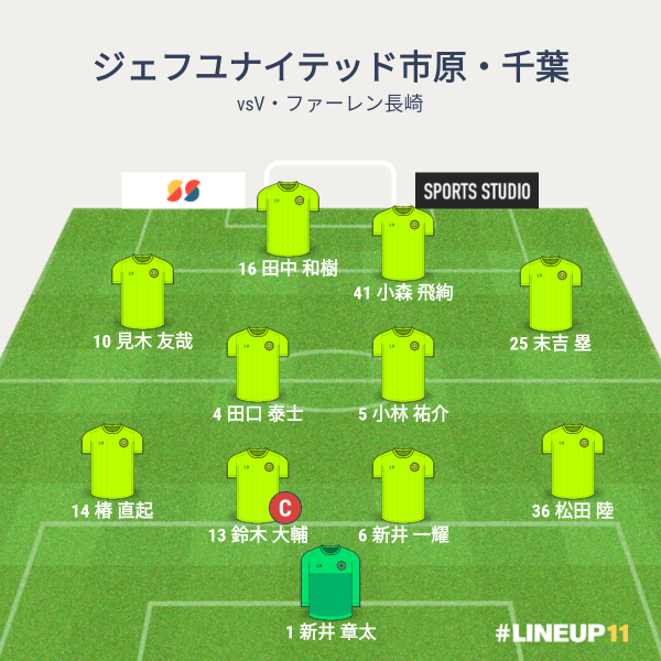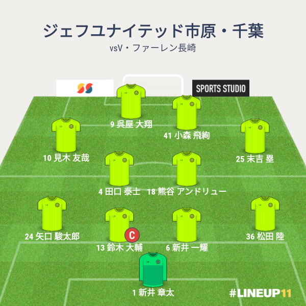 ジェフの先発は、GKに新井章太、CBに鈴木と新井一耀、右SBに松田、左SBに矢口、ボランチに田口と熊谷、右SHに末吉、左SHに見木、2トップに呉屋と小森という布陣でした。ちばぎんカップから、先発、サブともに同じメンバーとなりました。